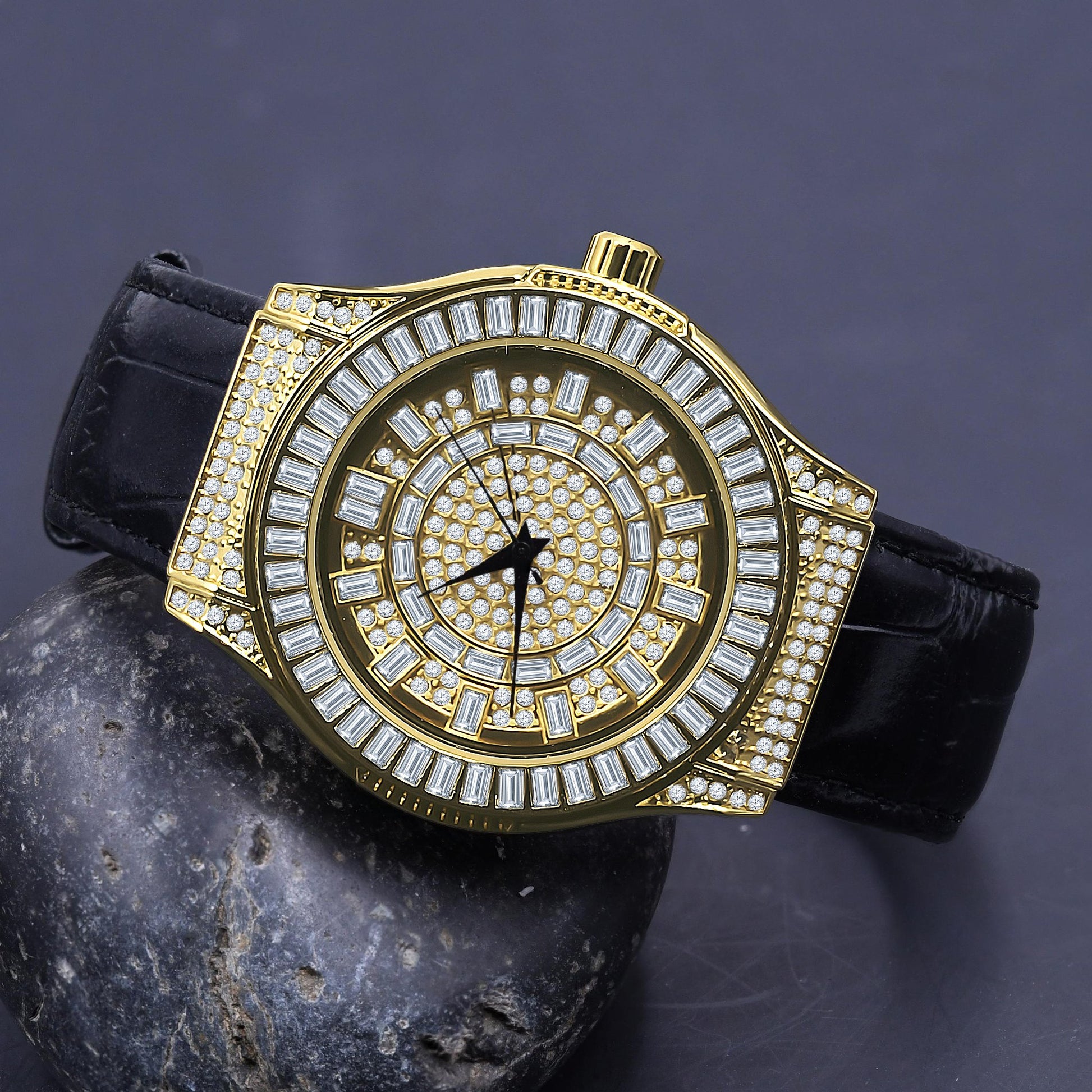 Conspicuous communicate time with this BRING, anchored in a time-honored tradition of watch making. This piece is Indulged with individuality that distinguishes it from casuals.Grand & distinct ! With a protuberant refulgent dial in the middle and coruscating layout style in collaboration with golden frame and a comfortable black leather band, this piece is sure to go unnoticed whenever its on your wrist.