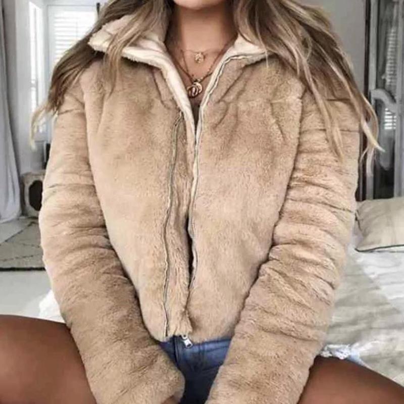 Turndown collar faux fur jackets Women long sleeve zipper