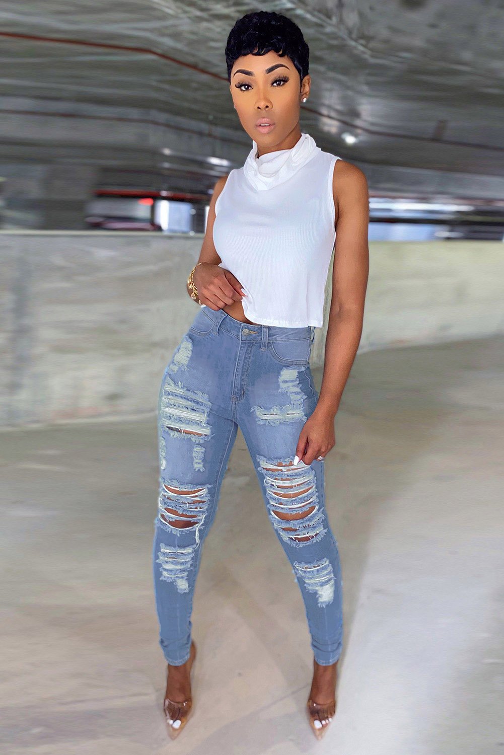 Light Blue Cut Out Distressed Ripped Pockets High Waisted Jeans